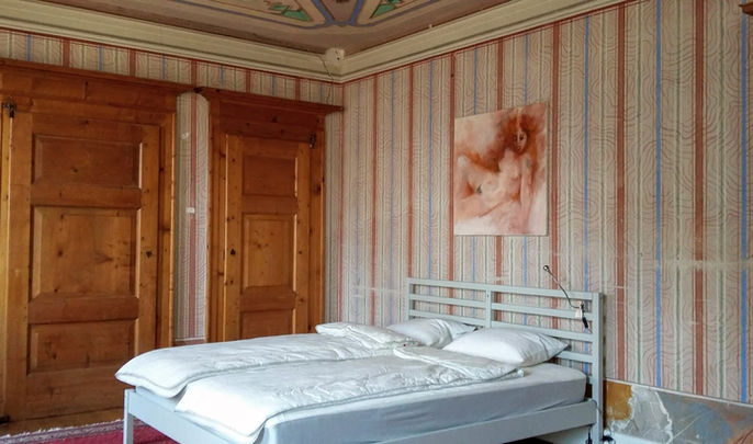 Die Ferienwohnung im 1. OG wurde sanft renoviert. Die Deckenmalerei im Wohnzimmer wurde erhalten und die Wände mit den ursprünglichen Farben neu gestrichen. Im Schlafzimmer erwartet sie eine farbenreiche gut erhaltene Deckenmalerei und farbige Wände. Hier fühlen Sie sich in eine andere Zeitepoche versetzt.